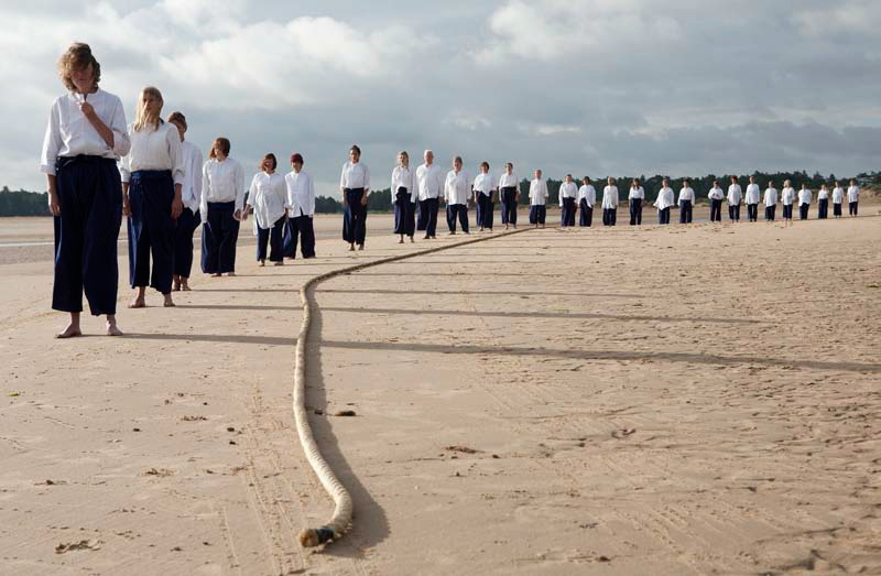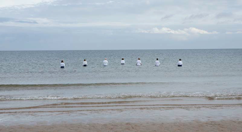 On the beach, the sea glistens mirage-like in the distance. In the early morning light a group of singers and swimmers strike out towards the water’s edge until they span the wide expanse of beach. They each look towards the sea, eyes intent, focused on the horizon, searching for something. Is somebody lost at sea?